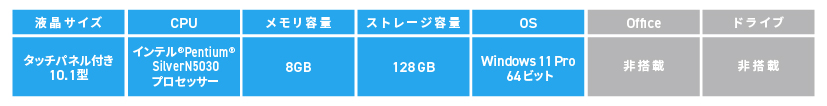 製品名 ビジネス2in1 K60/FW 型番 A6K1FWT8111A OS Windows 11 Pro 64ビット(22H2) CPU インテル® Pentium® Silver N5030 プロセッサー 1.10GHz(バースト周波数3.10GHz) ディスプレイサイズ タッチパネル付き 10.1型 WXGA 広視野角 メモリ 8GB ストレージ 128GBフラッシュメモリ 質量 タブレット:約610g、キーボードドック接続時:約1,180g 駆動時間 JEITAバッテリ動作時間測定法(Ver2.0):約16.0時間 ペン入力 アクティブ静電結合方式(専用充電式アクティブ静電ペン)(別売)注:当サイトにてペンの販売はしておりません。dynabook公式ストアにて別途お求めください。 キーボード 84キー(JIS配列準拠)、キーピッチ:17mm、キーストローク:1.2mm Webカメラ フロントカメラ 有効画素数 約200万画素+リアカメラ 有効画素数 約500万画素 無線LAN IEEE802.11a/n/ac(867Mbps)+b/g Bluetooth® Bluetooth® (Ver5.1) 通信 なし ワイヤレスWAN ― セキュリティチップ インテル®PTT 指紋認証 ― 保証期間 1年保証(引き取り修理・海外保証(制限付)1年) Office ― 無線転送 ―