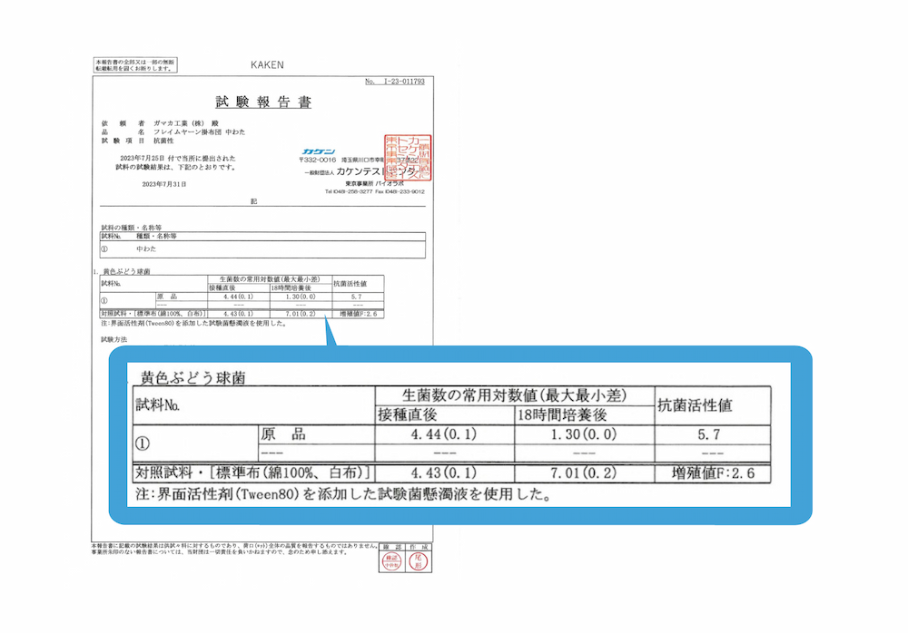 抗菌活性値の試験基準「2.2」を超えた結果となっています。
