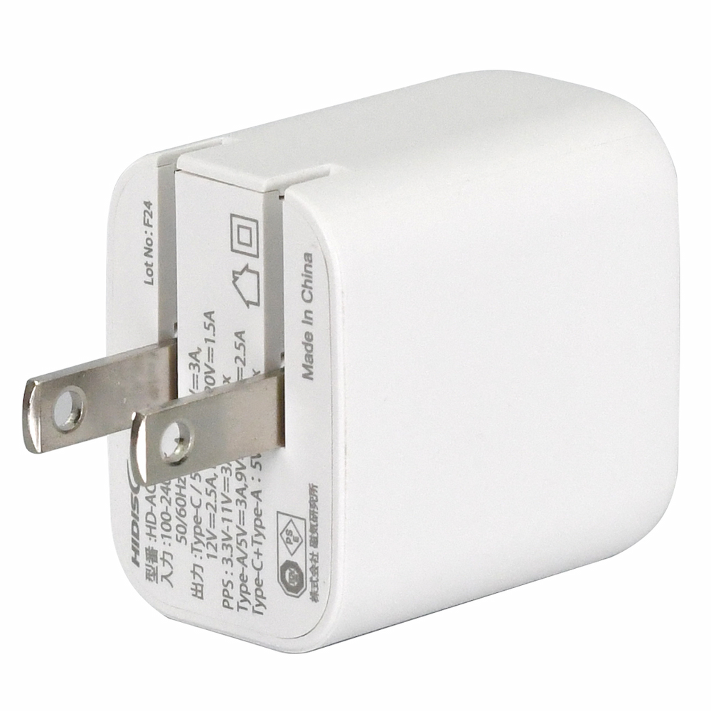 型番 HD-AC2P30WH JANコード 4984279870976 ポート数 Type-C+Type-A 2ポート カラー ホワイト サイズ 約H43×W40×D28mm 重さ 約52g 入力 100-240V~50/60Hz 1.0A 出力(Type-C) 5V/3A,9V/3A,12V/2.5A,15V/2A,20V/1.5A 最大30W 出力(Type-A) 5V/3A,9V/3A,12V/2.5A 最大30W 出力(PPS) PPS:3.3V-11V/3A 出力(Type-C+Type-A total) 5V/4A 最大 プラグ形状 2P(スイングプラグ)