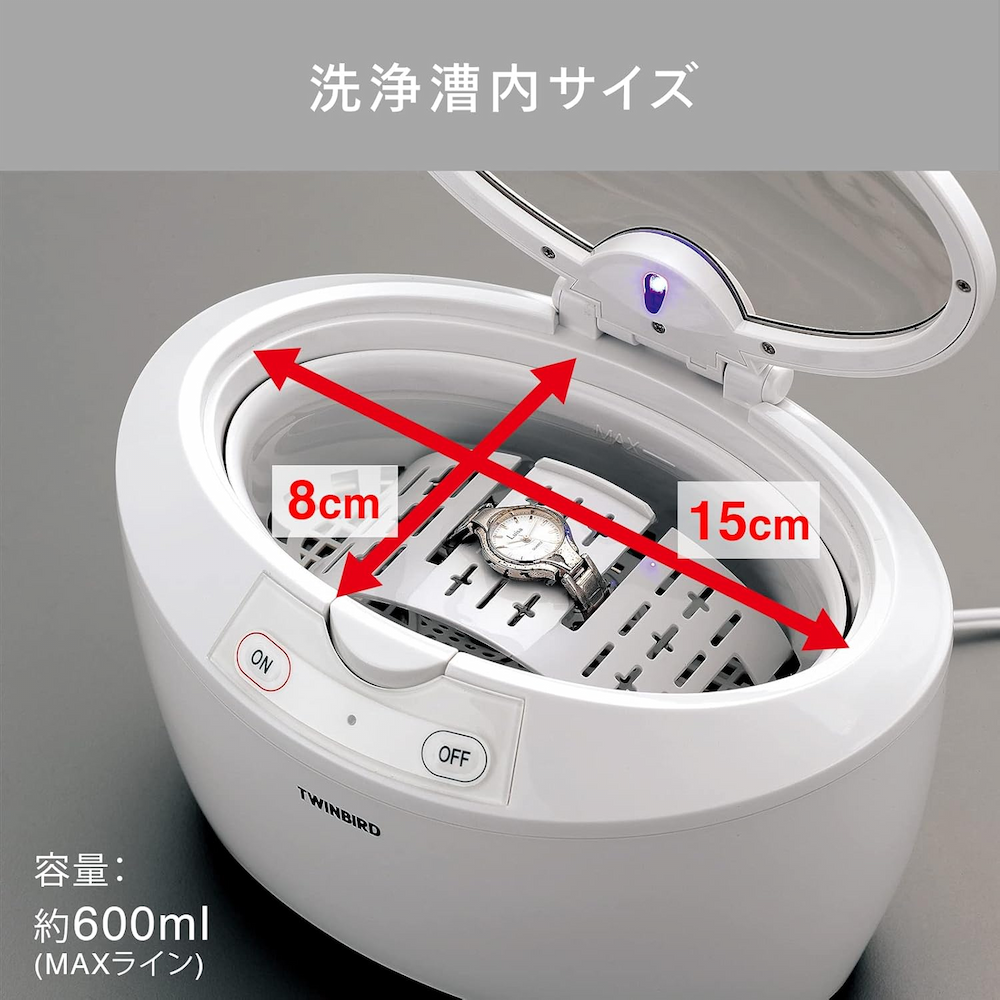 製品寸法 約 W225×D155×H145 mm 製品質量 約 995g(付属品含む) 約 935g(製品のみ) 電源 AC100V 50/60Hz 消費電力 26W タイマー ICタイマー 約3分間オートオフ 洗浄槽容積 725ml(MAXライン600ml) 洗浄層内寸法 約 W160×D90×H45 mm 洗浄かご内寸法 約 W150×D80×H45 mm コード 長さ 約1.5m 付属品 洗浄カゴ、アクセサリーホルダー