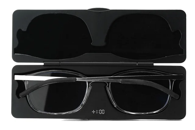 ケースに入れてもわずか6mmの老眼鏡「スリムグラス」。スマホよりも薄く、重さはわずか13gと、かけていることを忘れるほどの軽さです。