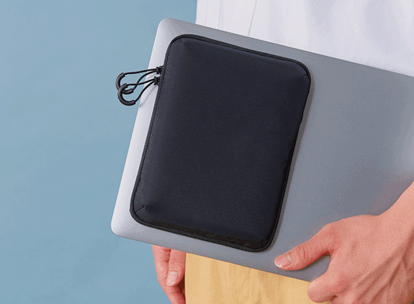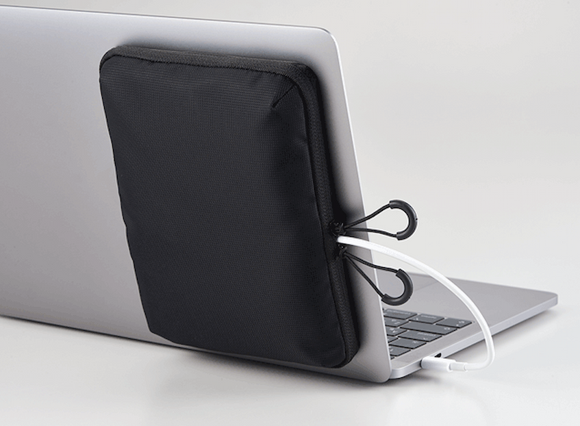 ノートPCに直接貼り付けられるポーチ。貼り付けたまま持ち運べるので、散らばりがちな周辺機器をひとまとめにでき、落下や紛失の防止にもなります。ファスナーからケーブルを引き出して繋げるなど、様々な使い方が可能です。