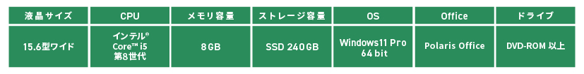 コストパフォーマンスに優れた、15.6型ワイド液晶モデルの中古品ノートPCです。高解像度のHDディスプレイ、高速処理が可能な64bitOSやPolaris Officeの搭載により、ビジネスに即した高性能で最適なPC環境を実現しています。