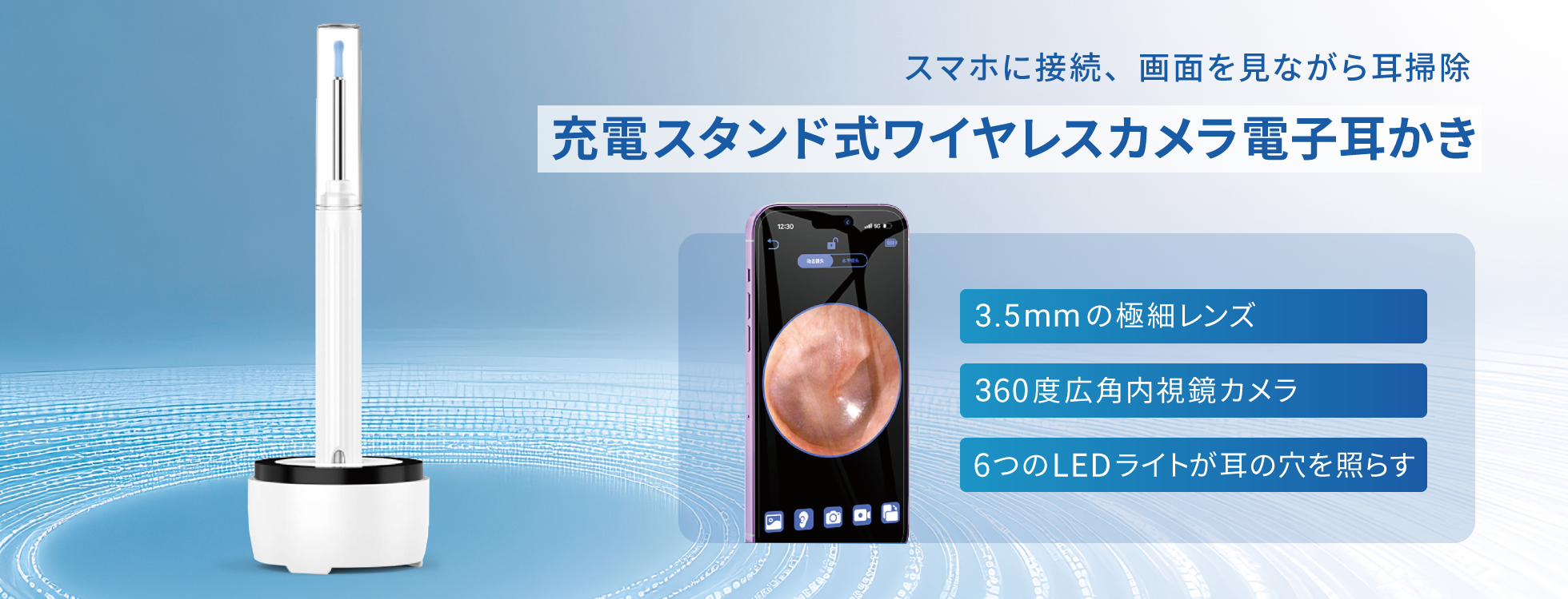 スマホにWi-Fi接続して画面を見ながら耳掃除ができる、充電スタンド式のワイヤレスカメラ電子耳かきです。