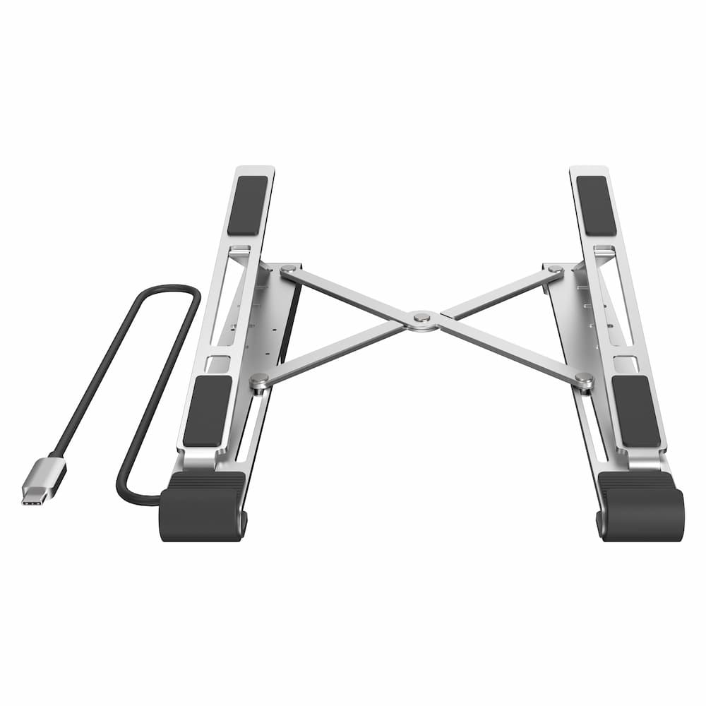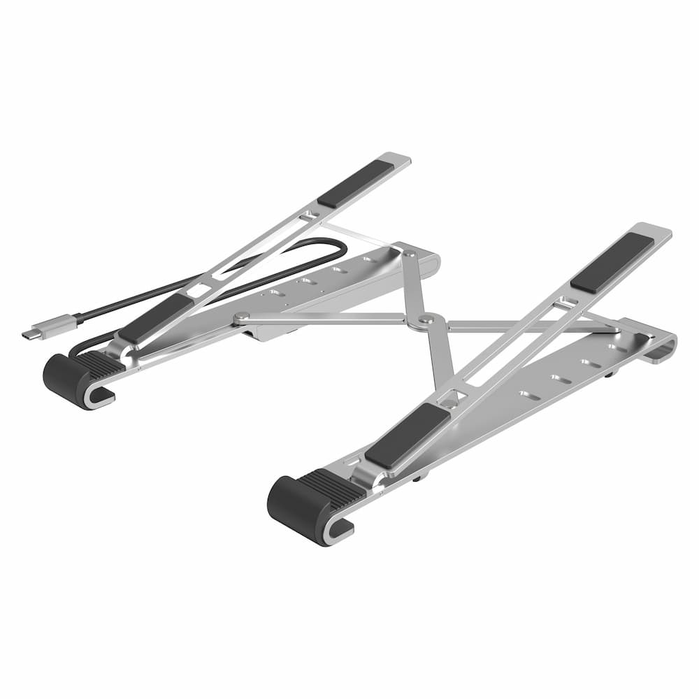 ノートパソコンを載せて5段階に角度調整ができるスタンド一体型。折りたたみでき持ち運びにも便利です。