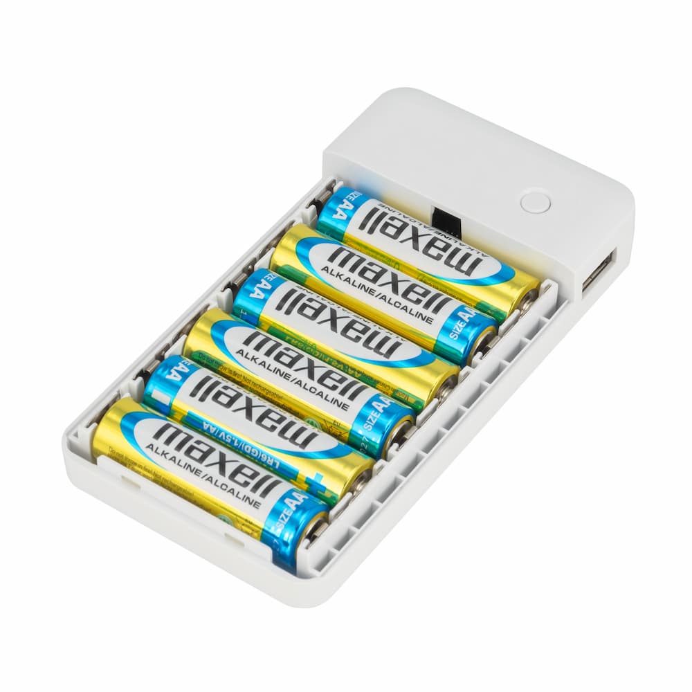 単3形アルカリ乾電池や単3形ニッケル水素電池を6本使用して、スマートフォンの充電ができる乾電池式モバイルバッテリーです。