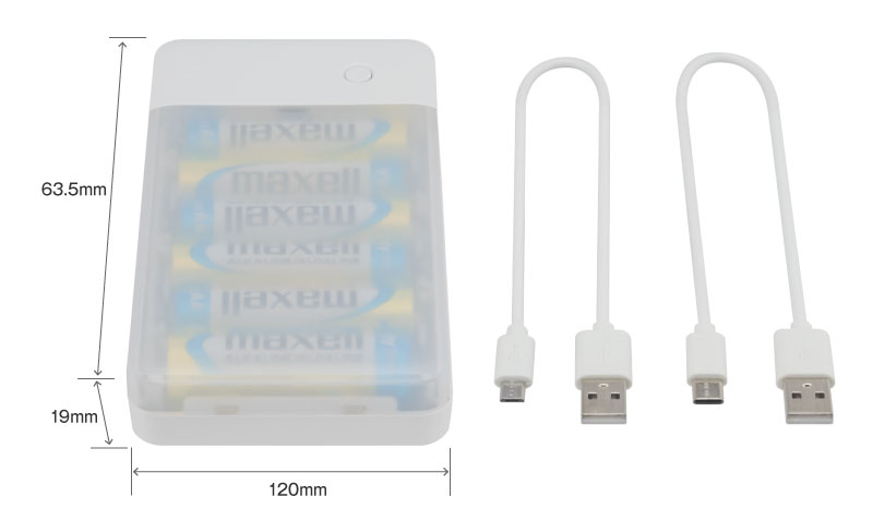 最大出力 5V/1.5A 対応電池 単3形アルカリ乾電池、単3形ニッケル水素充電池 6本 保護機能 過電流保護、短絡保護 コネクタ形状(本体) USB Type-Aポート 機器充電時間 スマートフォンを1時間30分で60%まで充電可能(注1~3) 動作温度範囲 0℃~35℃ 動作湿度範囲 10%~60%(結露なきこと) 材質 PC RoHs指令 対応 外形寸法 W63.5×D19×H120mm 本体重量 約65g(乾電池を含まず) 保証期間 6ヶ月間 付属品 専用USB Type-Cケーブル(30cm)、専用microUSBケーブル(30cm)、単3形アルカリ乾電池×6本、取扱説明書/保証書