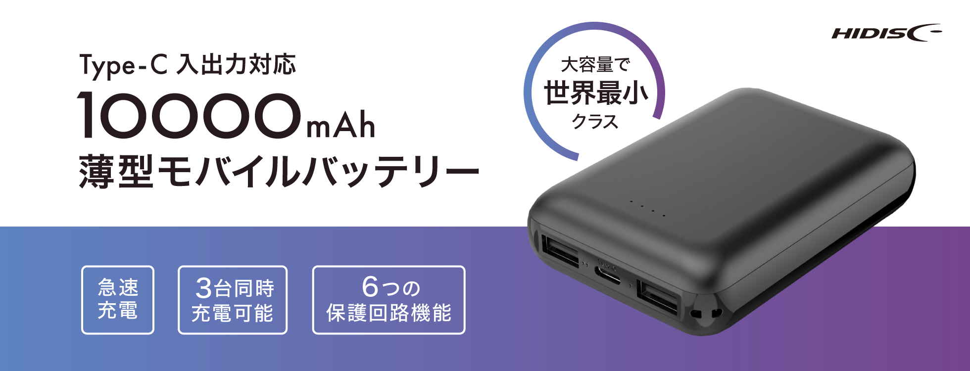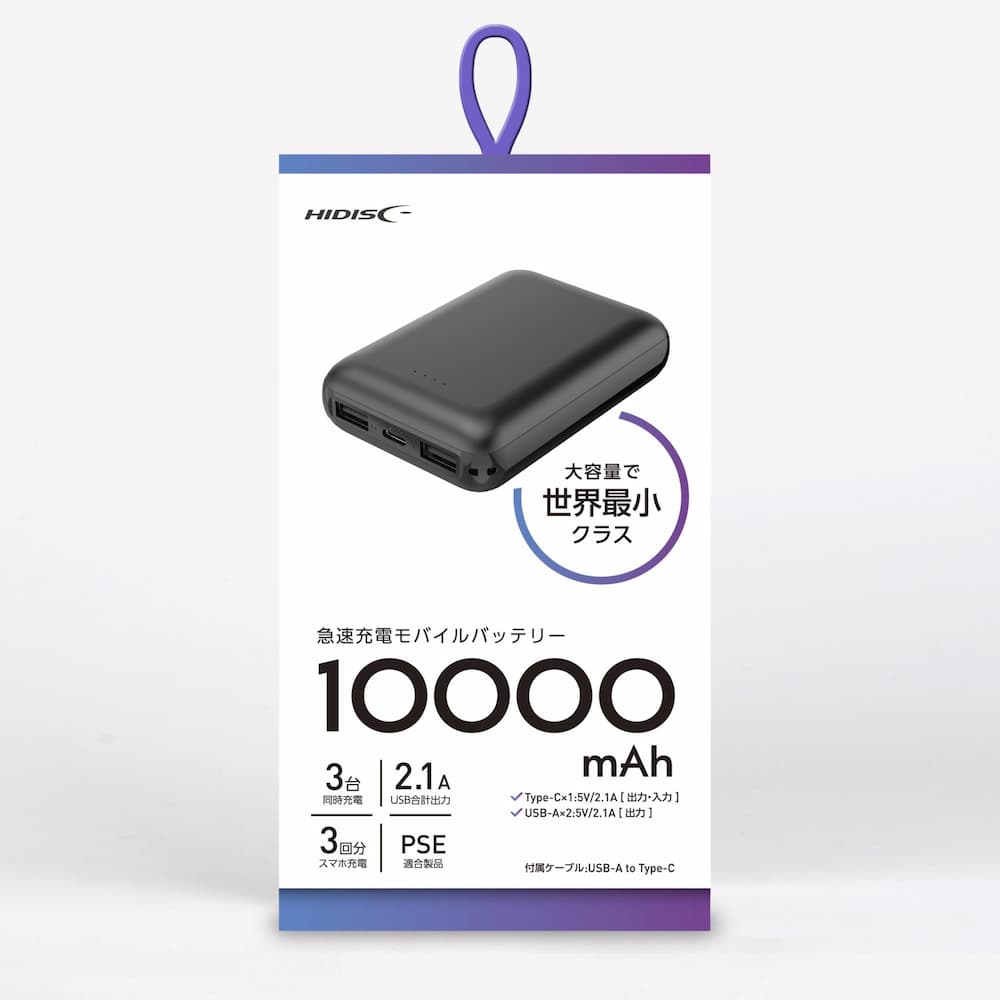 ポケットにすっぽり収まるコンパクトボディでありながら、10000mAhの大容量モバイルバッテリーです。USB Type-C入出力対応の急速充電。スマホやタブレットなどを3台同時に充電できます。6つの保護機能を備えた安心の回路設計で、外出用や災害時の備えとしても活躍します。