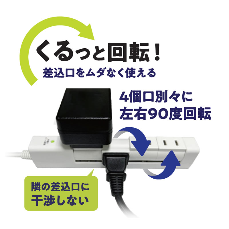 4個口別々にくるっと左右90度回転。隣の差込口に干渉しないので差込口をムダなく使える回転式電源タップ(1m)です。雷ガード、トラッキング防災予防の絶縁キャップを搭載しています。