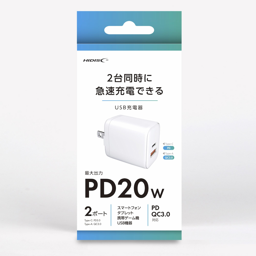 商品名 HIDISC 2台同時に急速充電できるUSB充電器 USB-C x1 Ax1 ポート 型番 HD-AC2P20WH JANコード 4984279870952 ポート数 Type-C ポート×1、Type-Aポート×1 カラー ホワイト サイズ 約H45×W43×D28.1mm 入力 100-240V~50/60Hz 0.6A 出力 Type-C:5V/3A、9V/2.22A、12V/1.67A