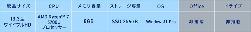 メーカー NEC 商品名 NEC VersaPro VK743/C-J 型番 PC-VK743CXGHC8JZQYZY JAN 2009136298501 モニター 13.3型ワイドTFTカラーIPS方式液晶(フルHD:1920×1080ドット LEDバックライト ノングレア) CPU Ryzen 7 5700U(最大4.30GHz) グラフィックス AMD Radeon グラフィックス メモリ 8GB 容量 256GB(SSD) OS Windows11 Pro 光学ドライブ なし 無線LAN 11a/b/g/n/ac/ax 有線LAN 最大1000BASE-T WEBカメラ あり テンキー なし リカバリディスク なし ディスプレイ出力 HDMI USBポート数 Type-A×2、Type-C×1 Office なし 本体サイズ 307×216×17.9mm 重量 約971g 駆動時間 約10.5時間 保証期間 1年間