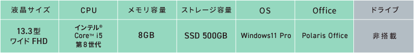 インテル® Core™ i5 第8世代、500GB SSD搭載の中古品ノートPCです。高速処理が可能な64bit OSを搭載。持ち運びに便利な薄さ約15.5mmの超薄型筺体を実現し、HDMI・有線LAN・USB3.1(Type-C)など充実のインターフェースを装備しています。