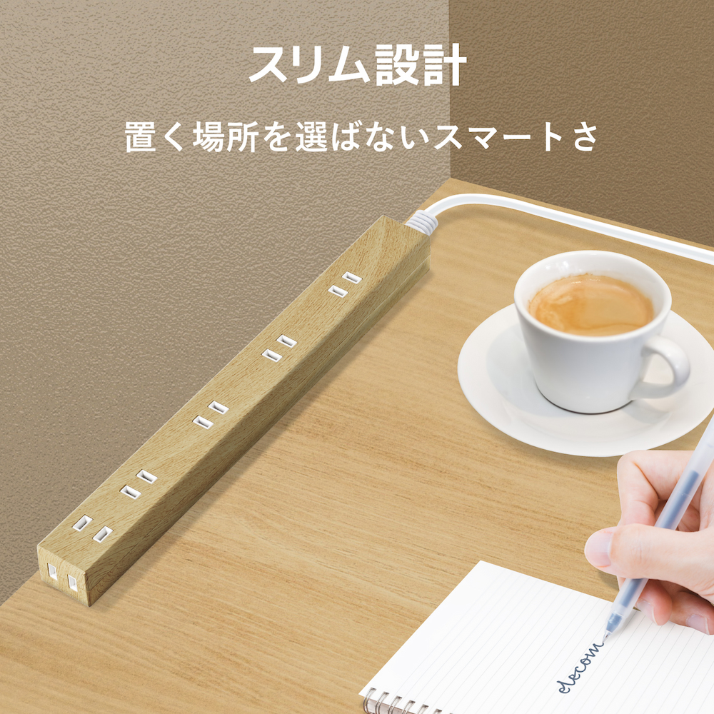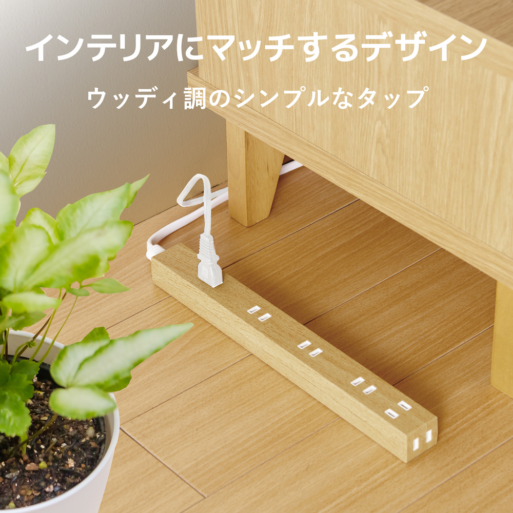 インテリアに馴染む木目調デザインの電源タップ(2個セット)。差込口数がトップ5個口・サイド1個口と多く、さらに間隔が通常のタップと比較して広いため、幅広の機器でもすっきり接続できるスリムデザインです。雷サージから電子機器を守る、高性能雷サージ吸収素子を内蔵しています。