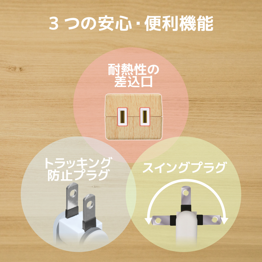 - 差込口に耐熱性に優れたユリア樹脂を使用しており、万一の発熱の際にも融解しにくく電気火災の防止に有効。