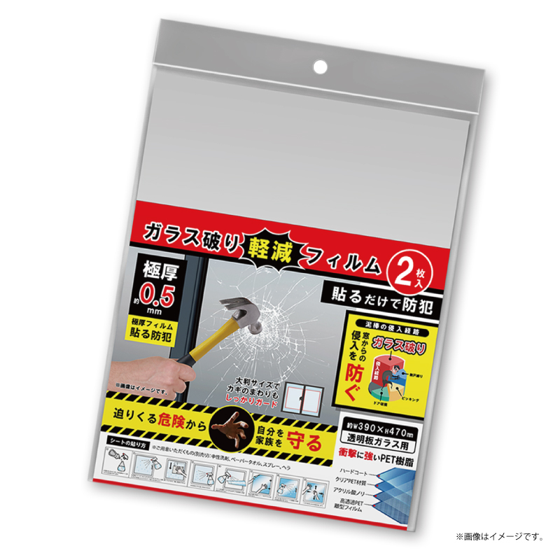 ガラスに貼るだけで防犯になる約0.5mmの極厚フィルム。衝撃に強いPET樹脂で、鍵周りまでしっかりガードできる大判サイズです。泥棒のガラス破りによる侵入や、災害による破片の飛散などから家を守ります