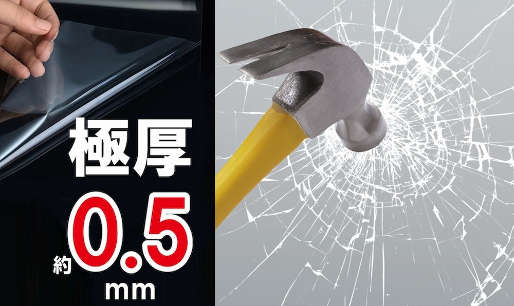 ガラス破り軽減フィルムは、窓ガラスなどが衝撃で割れた際に破片の飛散を防止する極厚のシートです。
