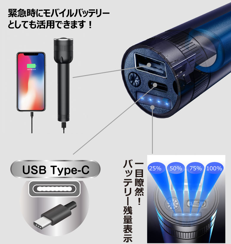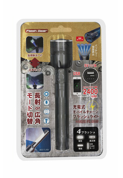 広角モード・長照射モードに調節できる充電式フラッシュライトです。サイドライトで手元も明るく照らせます。防災、停電、アウトドア、夜散歩などあらゆるシーンで活躍。緊急時はモバイルバッテリーとしても使えます。