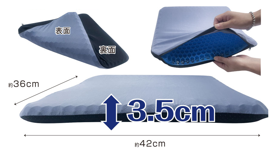 冷感タイプのジェルクッションです。接触冷感を示す最大熱吸収速度値はQ-max0.41。滑り止め加工を施した接触冷感カバーも付属しています。高弾性ゲルが体圧を分散するため変形しにくく、長時間座っていても体が沈みにくいのが特徴です。また二重ハニカム構造で通気性が良く、カバーをつけていてもムレにくいので快適に座ることができます。