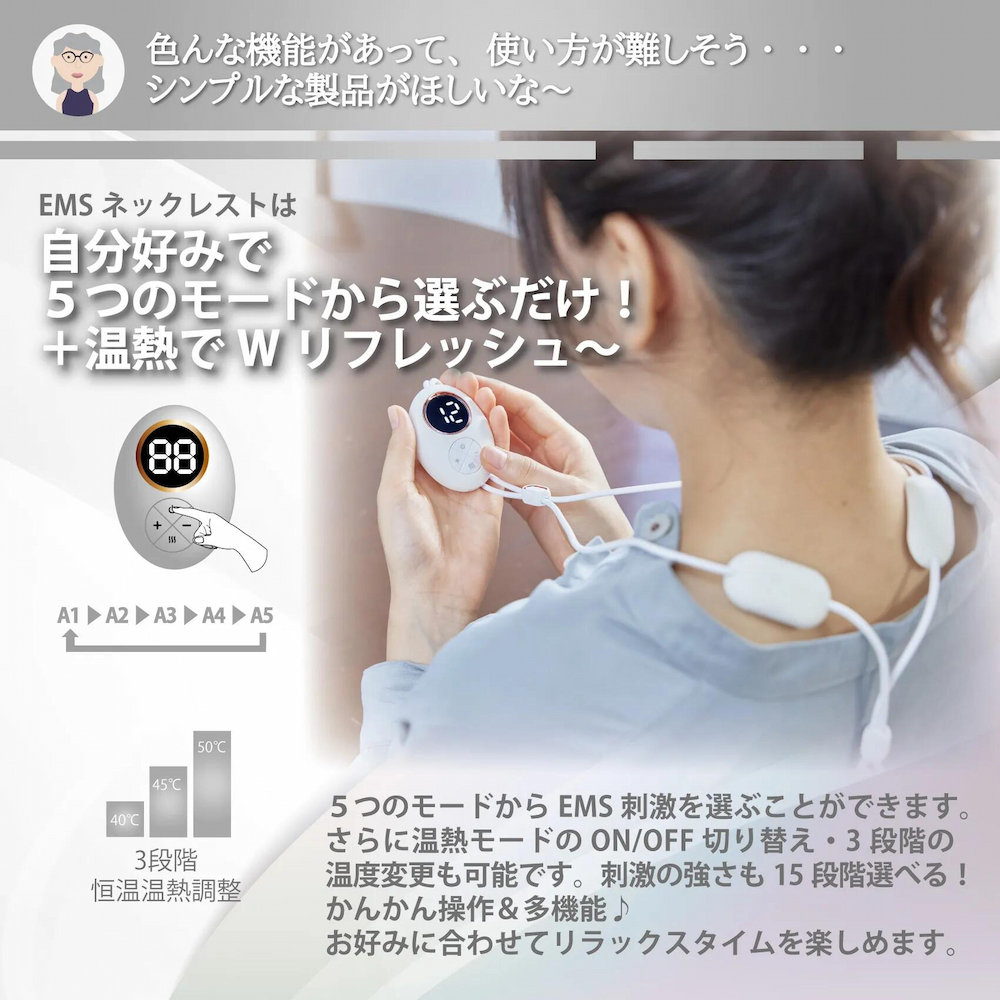 そんな現代人の悩みに、首にかけるだけのかんたん首用EMS