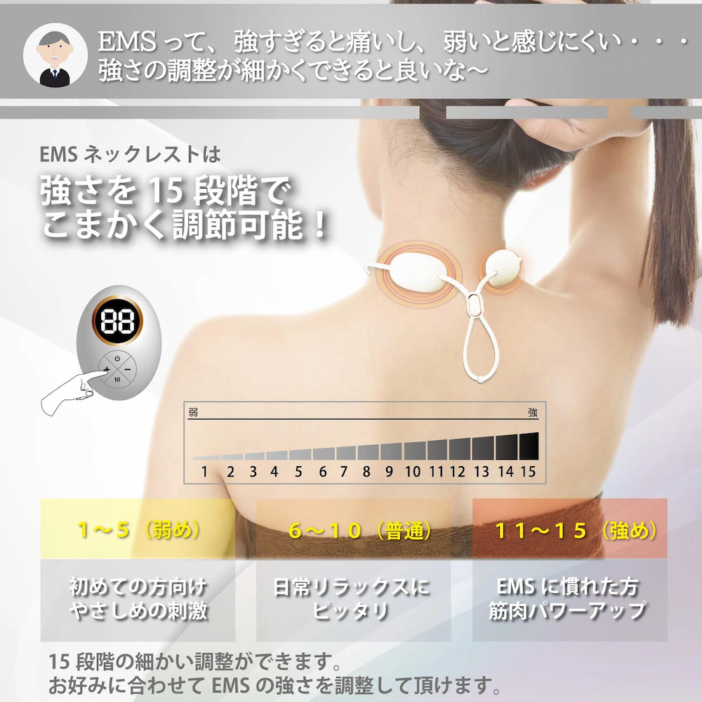 肩や首の調子やお好みに合わせてEMSの強さを調整できます。