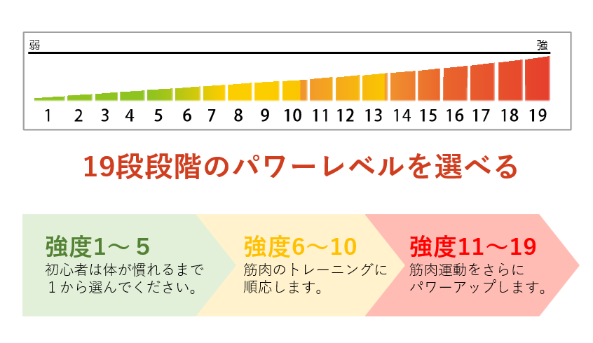 体調やトレーニング内容に合わせてEMSの強さをお好みに調整できます。