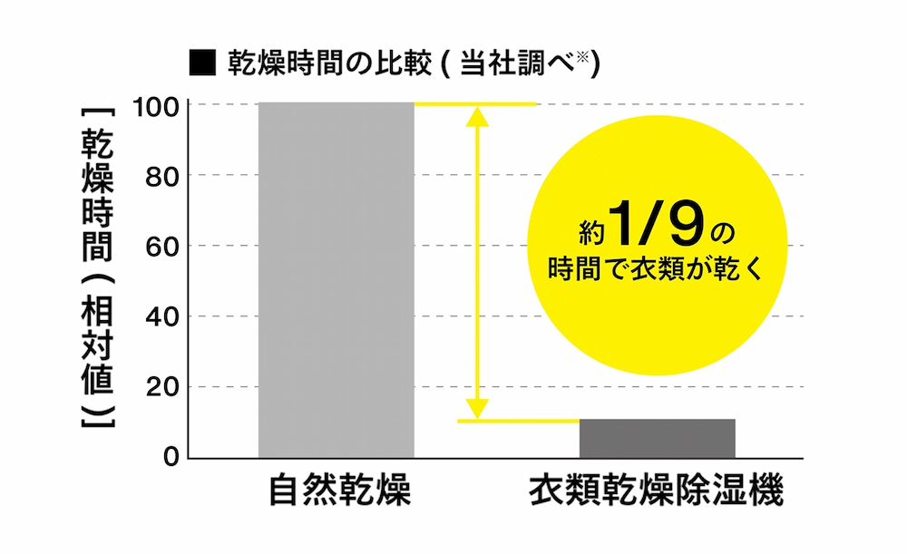 自然乾燥と比較すると約1/9(注)の時間で衣類を乾燥させます。自然乾燥だと時間がかかってしまったり、乾ききらないといった悩みを解消します。夜にお洗濯をして翌日使いたい洋服や厚手のタオルなど乾くか不安な衣類の乾燥におすすめです。