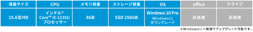 注:Windows11へ無償でアップグレード可能です。CPU インテル® Core™ i5-1235U プロセッサー ディスプレイ 15.6型HD メモリ 8GB(8GB×1) 容量 SSD 256GB 無線LAN Wi-Fi 6 有線LAN 有 WEBカメラ 有 リカバリディスク なし ディスプレイ出力 HDMI USBポート数 Type-A×3、Type-C×1 本体サイズ 359.4×233.9×19.9mm 重量 約1,790g 駆動時間 約9.8時間 同梱物 HP 45WスマートACアダプター、電源コード、保証書等