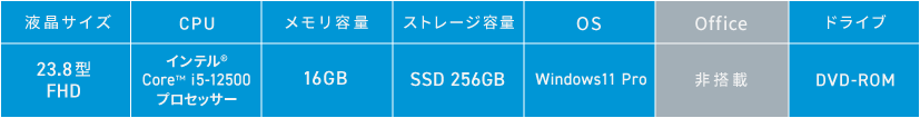 商品名 HP ProOne 440 G9 型番 B7VB0AT#ABJ JANコード 4582712601356 OS Windows11 Pro CPU インテル® Core™ i5-12500 プロセッサー ディスプレイ 23.8型FHD メモリ 16GB 容量 SSD 256GB 光学ドライブ DVD-ROM(9.5mmスリムライン) 無線LAN なし 有線LAN 有 WEBカメラ 有 リカバリディスク なし ディスプレイ出力 HDMI×1、DisplayPort×1 USBポート数 Type-A×5、Type-C×1 本体サイズ 539.3×225×379.4mm 重量 約7.775g 同梱物 保証規定(サービスおよびサポートを受けるには)、クイックセットアップ、USB 320K キーボード(日本語)、USB 320M 光学マウス、電源コード、モニタースタンド、保証書等