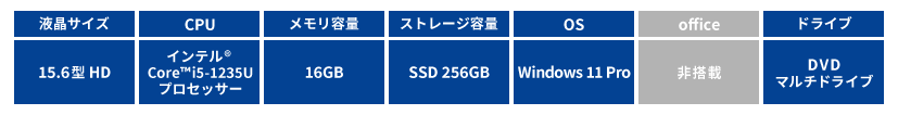 商品名 dynabook B55/KW 型番 A6BVKWLC571A JANコード 4571588063023 OS Windows11 Pro CPU インテル® Core™ i5-1235U プロセッサー ディスプレイ 15.6型HD メモリ 16GB 容量 SSD 256GB 光学ドライブ DVDスーパーマルチドライブ 無線LAN Wi-Fi 6E 有線LAN 有 WEBカメラ 有 リカバリディスク 有 ディスプレイ出力 HDMI USBポート数 Type-A×3、Type-C×1 本体サイズ 379×257.9×16.9mm 重量 約2.200g 駆動時間 約11時間 同梱物 ACアダプター、電源コード、取扱説明書(マニュアル)、保証書、バッテリーパック(本体装着済み)他