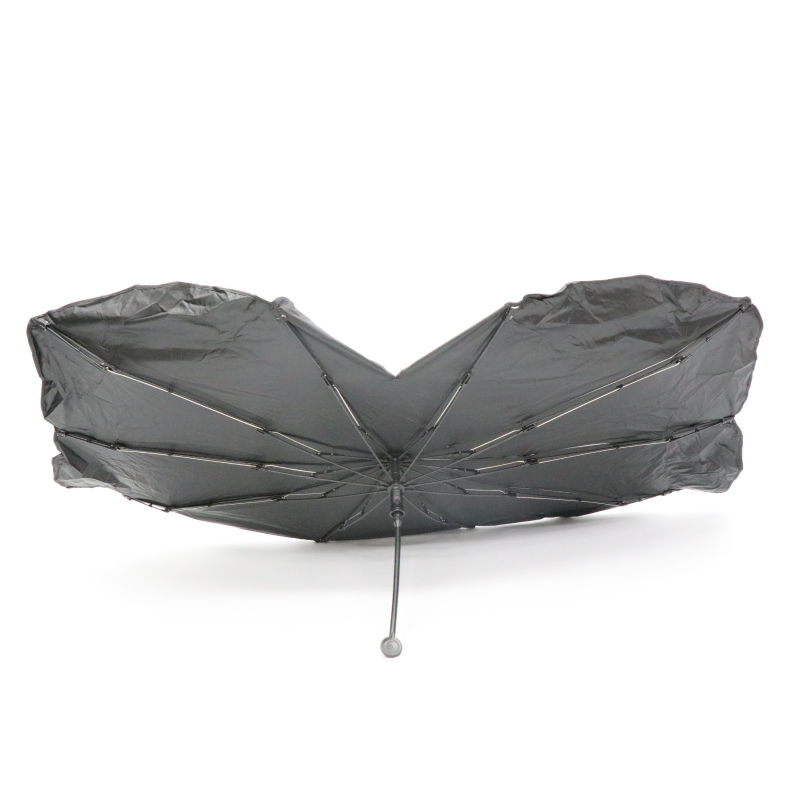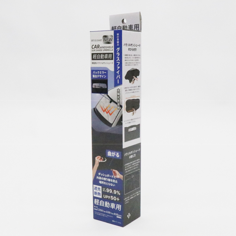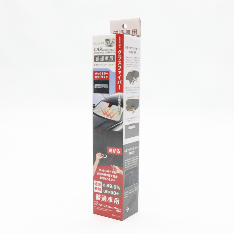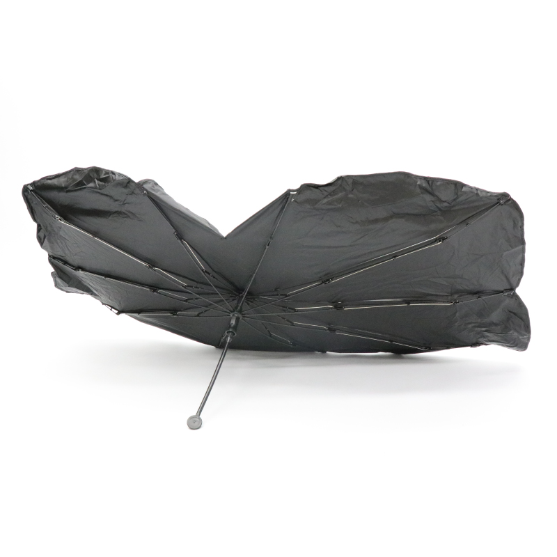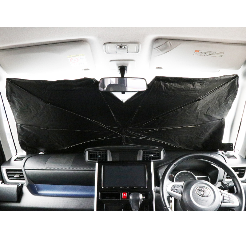 UVカット99.9%・UPF50+で駐車時の遮光断熱。簡単に取り付けられる傘型の車用サンシェードです。バックミラー露出デザインのため、バックミラーやミラー型ドライブレコーダーを保護します。またハンドルが曲げられるのでダッシュボード等の擦り傷を防止。場所も取らず、使わない時は専用袋に収納できて便利です。