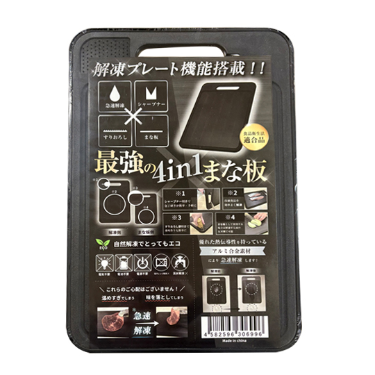 まな板、解凍プレート、シャープナー、すりおろし器が搭載された、1枚4役のまな板です。通常のまな板としてはもちろん、短時間の自然解凍、生姜やニンニクのすりおろし、包丁研ぎなど、マルチに活躍します。