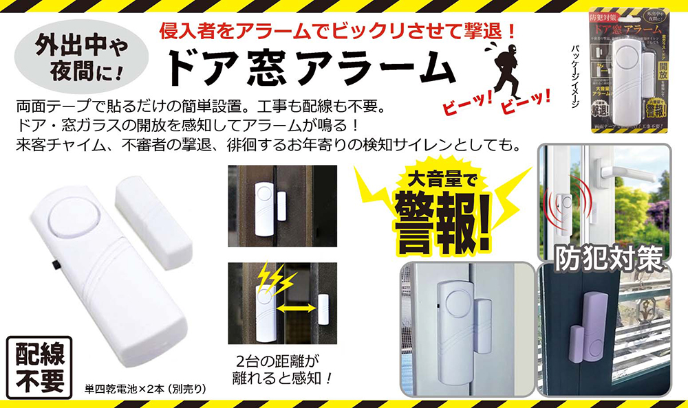 ドアや窓の開放を感知してアラームを鳴らす防犯グッズです。侵入者を大音量で撃退し、さらに家族や周辺へ危険を知らせることもできます。