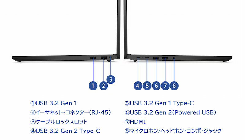 デジタル接続時(ドット・発色)最大 3840×2160ドット、1677万色(HDMI接続時)、60Hz/最大 5120×3200ドット、1677万色(USB Type-C接続時)、60Hz USBポート (Type-C ) USB 3.2 Gen1 (Video-out 対応) ×1、USB 3.2 Gen2 (Video-out 対応)×1 USBポート (Type-A ) USB 3.2 Gen1×1、USB 3.2 Gen2 (Powered USB)×1 ディスプレイ関連ポート(VGA) なし ディスプレイ関連ポート(HDMI) HDMI×1 オーディオ関連ポート マイクロホン/ヘッドホン・コンボ・ジャック イーサネット・コネクター(RJ-45) RJ-45×1 OneLink なし OneLink+ なし ドッキングコネクター なし イーサネット拡張コネクター なし イーサネット 10BASE-T/100BASE-TX/1000BASE-T ワイヤレス Wi-Fi 6対応 (IEEE802.11ax/ac/a/b/g/n準拠)(MediaTek 7921) WWAN なし Bluetooth Bluetooth v5.2(注2) WiGig 非対応 NFC なし オーディオ機能 Dolby Atmos スピーカー ステレオスピーカー マイクロホン デジタルマイクロホン 内蔵カメラ あり (前面:HD 720p カメラ、プライバシーシャッター付き) Expressカードスロット なし メモリーカードスロット なし SIMカードスロット なし その他のカードスロット なし キーボード 日本語キーボード (数値キーパッド付)(JIS規格準拠) 本体カラー ブラック カラーセンサー なし センサー類 なし ボタン類 なし 本体寸法 約W356.1×D247.7×H19.85mm 本体質量 最軽量構成時 1.78kg~(バッテリー・パックを含む) 梱包箱寸法 約W48.8×D8×H33cm 梱包時重量 約2.8kg メインバッテリー 固定式 3セル リチウムイオンポリマーバッテリー 47Whr セカンドバッテリー なし 使用時間(JEITA測定法 3.0) Ryzen 5 最大駆動時間、動画再生時 約9.9時間・アイドル時 約18.0時間(47Whバッテリー搭載時) 充電時間(パワーオフ時) 約 1.8時間 (パワーオフ) ACアダプター