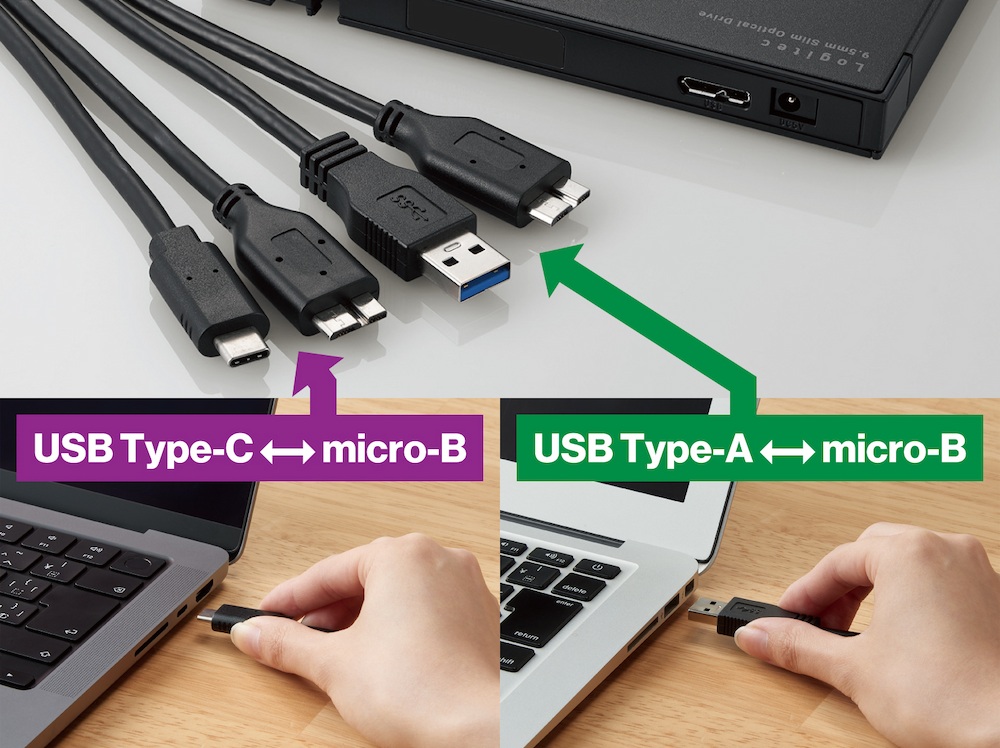 あらゆるPCユーザーにお使いいただけるようType-AケーブルとType-Cケーブルの2種類のUSBケーブルを標準添付。Type-Aポート、Type-Cポートのどちら搭載のPCでも、ケーブル1本で接続できます。