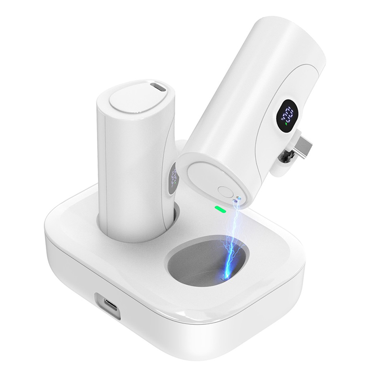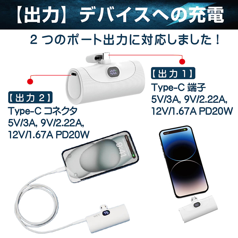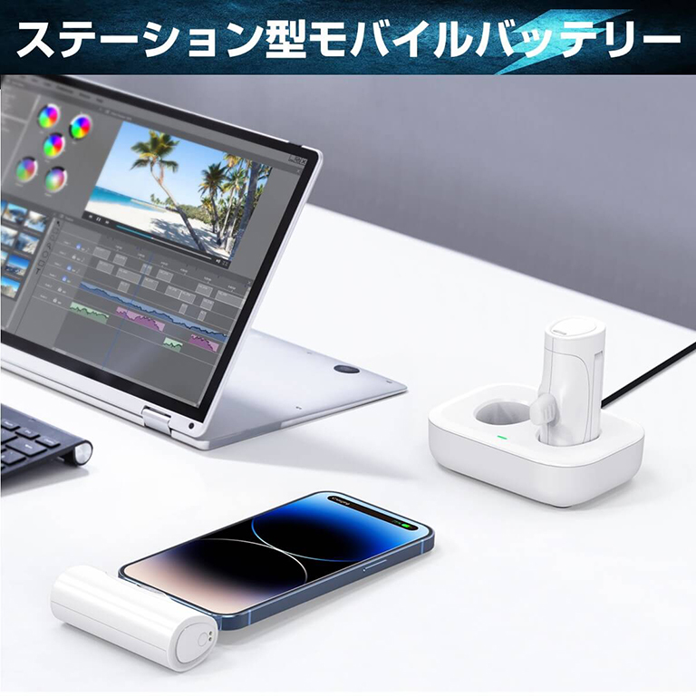 置くだけで簡単にスマホやイヤホンの充電ができる、充電用ドックとセットのモバイルバッテリーです。Type-C端子&コネクタの2ポートで、デバイスへ直接挿しての急速充電(PD20W)が可能。コンパクトで持ち運びやすく、スマホスタンドとしても使えます。