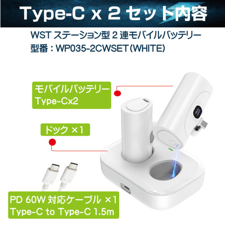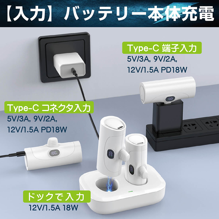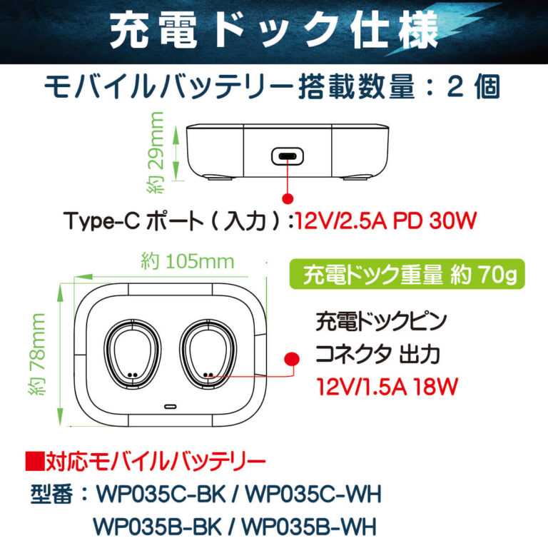 | 付属品 | ドック、モバイルバッテリー(Type-C)×2、ドック充電用ケーブル、取扱説明書 |