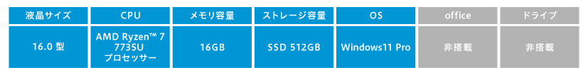 製品名 HP ProBook 465 G11 型番 A43A4PA#ABJ JANコード 4582712474271 モニター 16インチ(1920×1200) ノングレア CPU AMD Ryzen™ 7 7735U(最大周波数:4.75GHz) グラフィックス AMD Radeon グラフィックス メモリ 16GB(8GB×2) 容量 SSD 512GB OS Windows11 Pro 光学ドライブ なし 無線LAN Wi-Fi 6E 有線LAN 1000BASE-T WEBカメラ あり テンキー あり リカバリディスク なし ディスプレイ出力 HDMI×1 USBポート数 Type-A×2、Type-C×2 Office なし 本体サイズ 359×251×10.9mm 重量 約1.840g 駆動時間 約13時間 同梱品 ACアダプター、電源コード、保証書等 保証 新品メーカー保証1年間