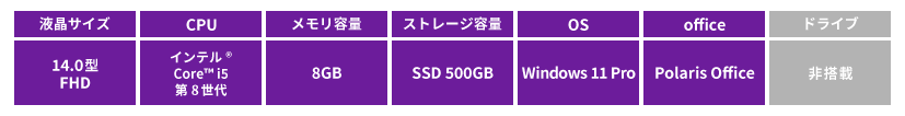 状態 中古:無期限保証 モデル名・型番 Panasonic Let's note LV8 搭載OS Microsoft Windows 11 Pro 64bit(MAR) CPU インテル® Core™ i5 第8世代 メインメモリ容量/種別 8GB メインストレージ容量/種別 新品 SSD 500GB オフィスソフト Polaris Office キーボード OADG準拠キーボード(87キー)、キーピッチ:19mm(縦・横)(一部キーを除く)、ストローク:2mm ディスプレイサイズ 14.0 型 ディスプレイ解像度 Full HD:1920×1080 タッチパネル なし カメラ 解像度:Full HD 1080p 光学ドライブ なし LAN 1000BASE-T/100BASE-TX/10BASE-T 無線LAN IEEE802.11a(W52/W53/W56)/b/g/n/ac準拠 Bluetooth Bluetooth v5.0 メモリーカードスロット あり USB USB3.1 Type-Cポート×1