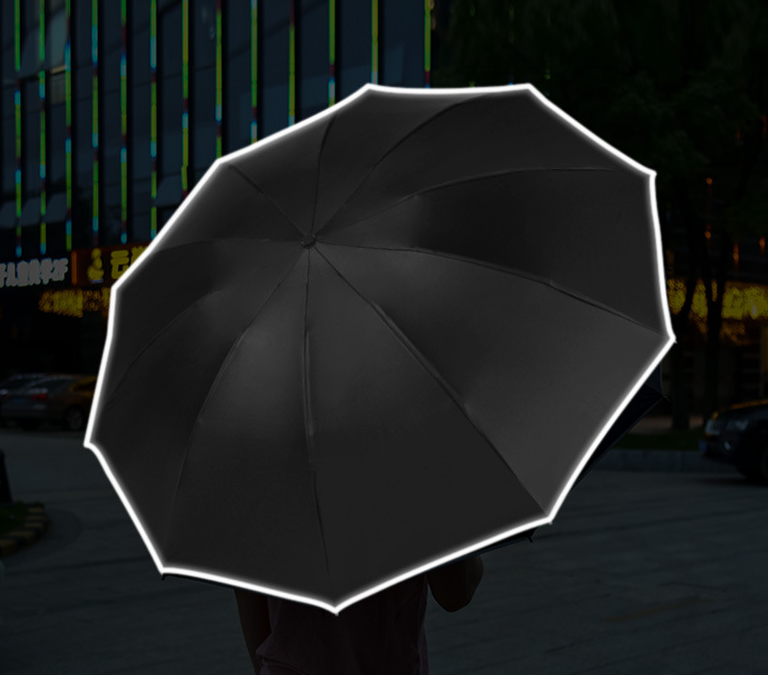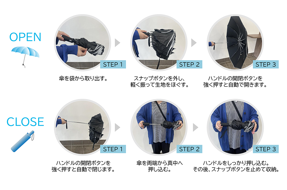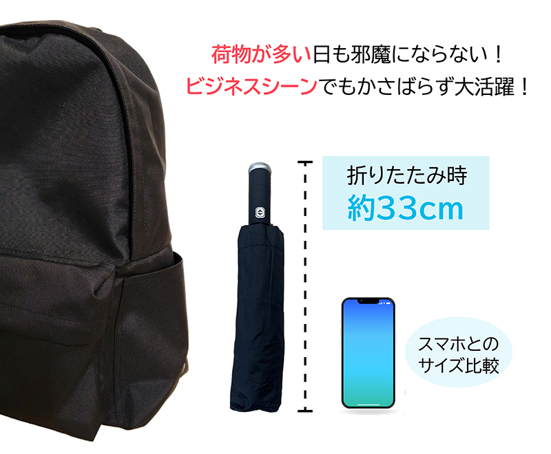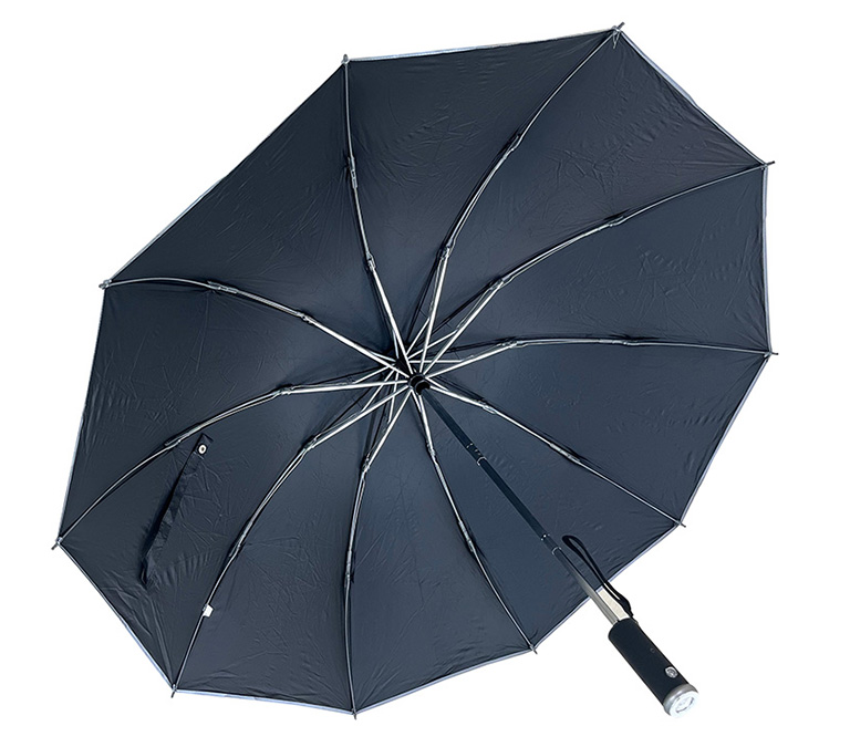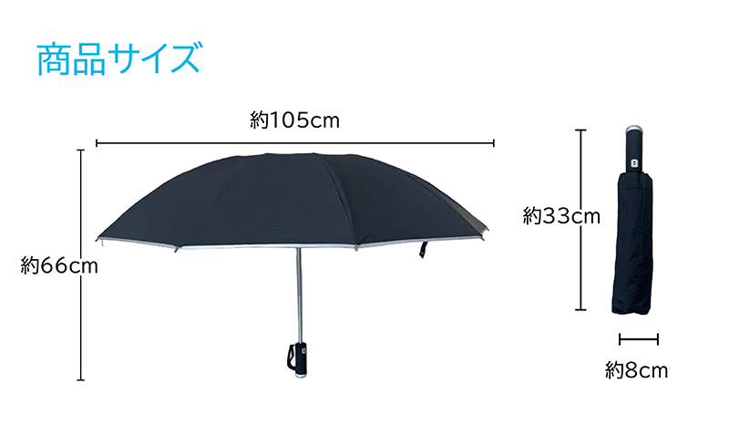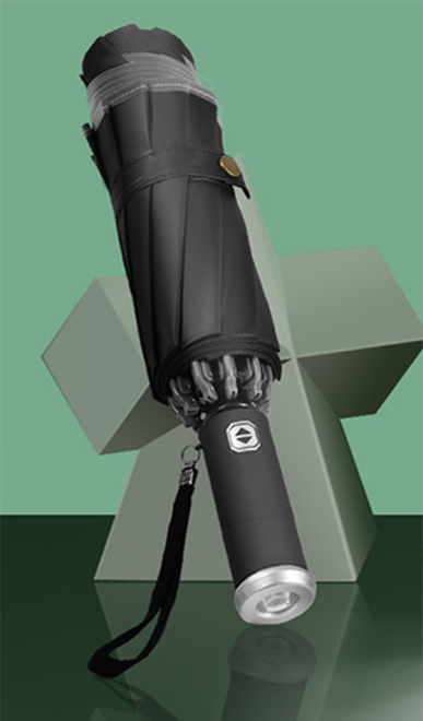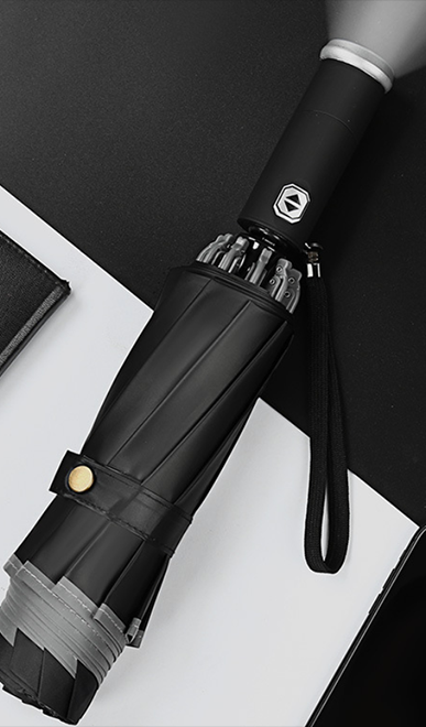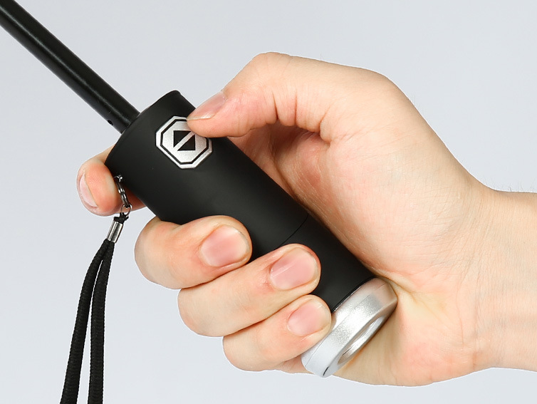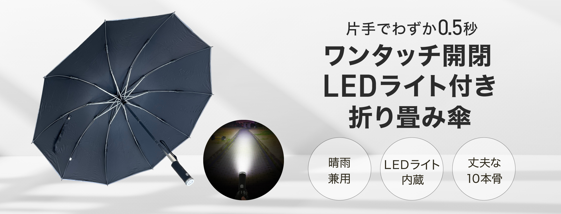 片手で操作できる、1プッシュ開閉タイプの折りたたみ傘です。ワンタッチで素早く開閉できるため、荷物が多い時や車の乗降時、急な雨でもサッと使えて便利。持ち手部分にLEDライトが付いており、暗くて足元が悪い時も安心です。