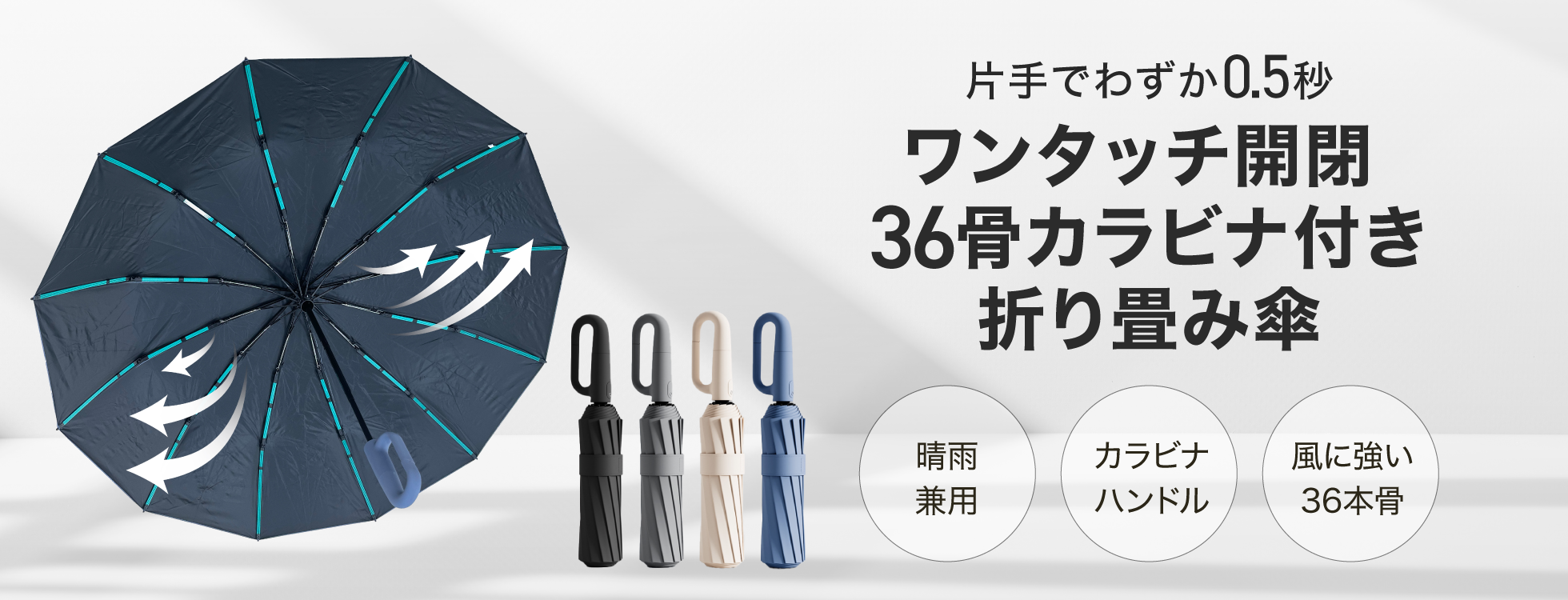 ワンタッチ開閉 36骨カラビナ付き折り畳み傘