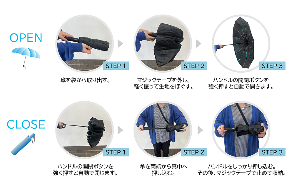 ボタンを押せば、0.5秒で開閉。ワンクリックで素早く差すことができます。車やバスの乗り降り、ひさしのない玄関での出入りなど、濡れやすい様々なシーンで活躍します。