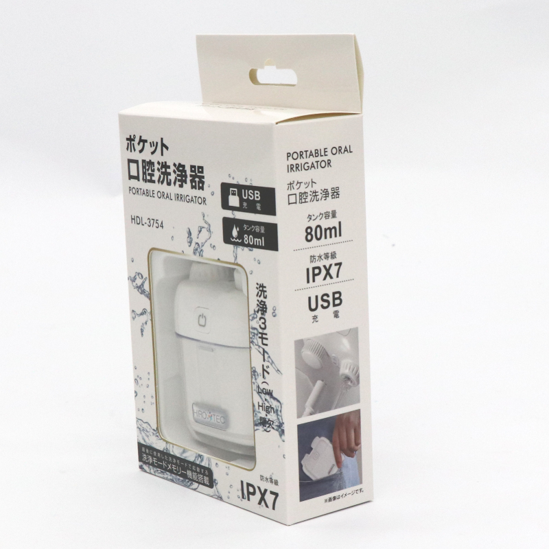 | 仕様 | 水量・水圧: (Highモード)255ml/分 690kPa (Lowモード)185ml/分 350kPa (間欠モード)229ml/分 350/690kPa 防水等級:IPX7 電池容量:リチウムイオン電池 900mAh(3.7V 3.33Wh) 入力電源:5V/1A 充電インタフェース:マグネット式コネクタ 充電時間:約2時間 使用可能時間: (Highモード)約22分 (Lowモード)約30分 (間欠モード)約25分 80ml(満水)の使用時間: (Highモード)約21秒 (Lowモード)28秒 (間欠モード)23秒 自動電源オフ時間:約1分 |