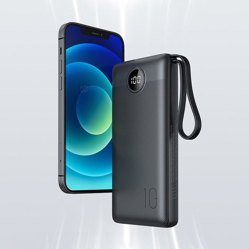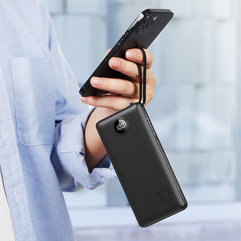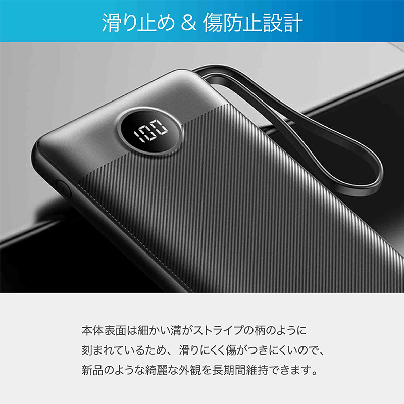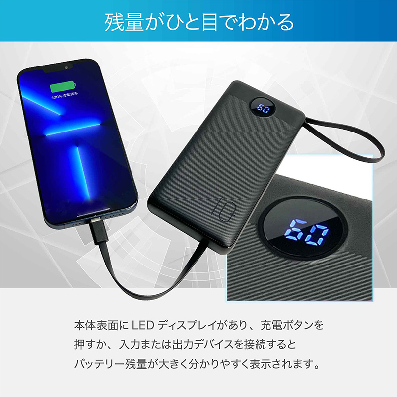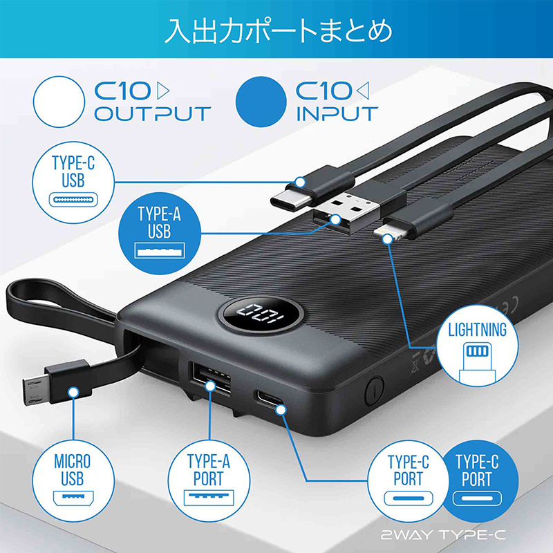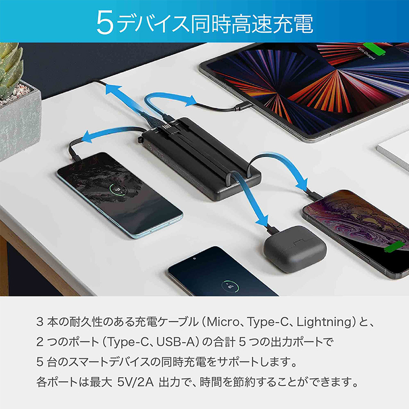 入出力用のケーブルを4本内蔵した、10,000mAhの大容量バッテリーです。コンパクトでスリムな設計にもかかわらず、USB-A・Micro B・TYPE-C×2・Lightningといった合計5つの出力ポートを備えており、スマートデバイス5台の同時充電をサポートします。最大5V/2A出力で充電時間を短縮できるため、緊急時にも便利です。