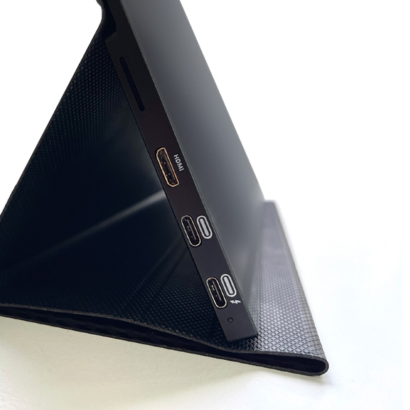 モニター背面にマグネットで着脱できるレザーケースが付属しています。カバーをめくって折りたたむことで、モニタースタンドとしてもご使用いただけます。