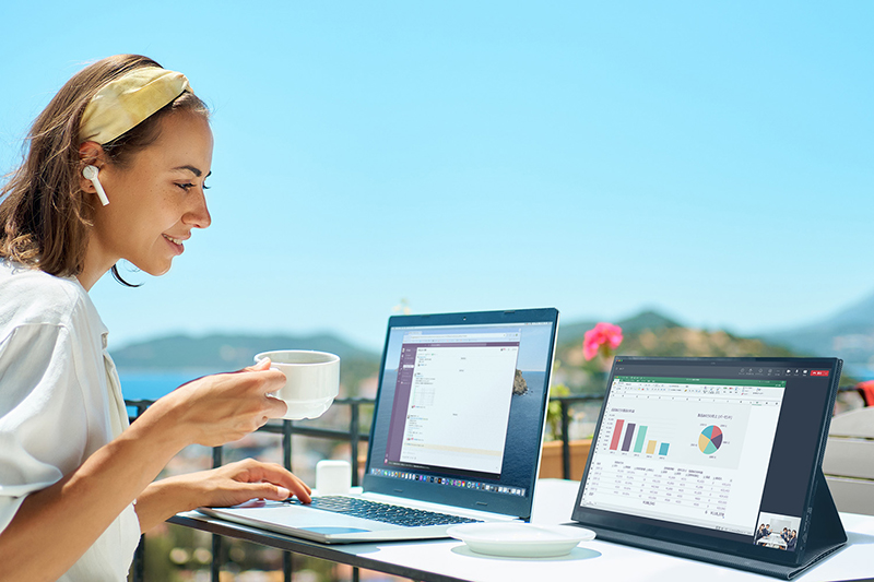 最薄部4mm、重量885gと薄くて軽いので、持ち運んで外出先でも使いやすい設計です。画面サイズは作業がしやすい15.6inchと大きめで、職場やカフェなど、どんな場所でもマルチモニター環境で作業効率を上げることができます。