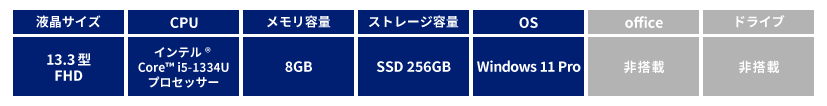 製品名 dynabook G83/LY 型番 A6G2LYL2121A JANコード 4571588102999 OS Windows 11 Pro 64ビット(24H2) CPU インテル® Core™ i5-1334U プロセッサー(最大周波数 Pコア:4.60GHz、Eコア:3.40GHz) ディスプレイサイズ 13.3型(1920×1080)FHD 高輝度・高色純度・広視野角(ノングレア) グラフィックス インテル® Iris Xe グラフィックス メモリ 8GB ストレージ 256GB SSD(PCIe、NVMe対応) 本体サイズ 306.0×210.0×17.9mm 質量 約875g 駆動時間 約7.5時間(動画再生時)/約21.0時間(アイドル時)(JEITAバッテリ動作時間測定法 Ver3.0)、約24.0時間(JEITAバッテリ動作時間測定法 Ver2.0) ペン入力 非対応 キーボード 86キー(JIS配列準拠)、キーピッチ:19mm、キーストローク:1.5mm 光学ドライブ なし Webカメラ 有効画素数 約92万画素(デュアルマイク付) 無線LAN Wi-Fi 6E(IEEE802.11ax)(2.4Gbps)+IEEE802.11ac/a/b/g/n Bluetooth® Bluetooth®(Ver5.3) 通信 1000Base-T/100Base-TX/10Base-T ワイヤレスWAN 非対応 セキュリティチップ TPM(TCG Ver2.0準拠) 指紋認証 非対応 ディスプレイ出力 HDMI×1 USBポート数 Type-A×2、Type-C×2 保証期間 1年保証(引き取り修理・海外保証(制限付)1年) Office なし リカバリ リカバリーイメージをSSD内に格納(Windows 11 Pro)