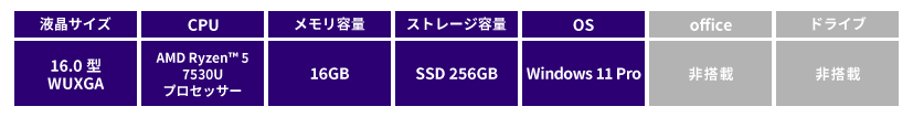 製品シリーズ ThinkPad E16 Gen 1 AMD 製品番号 21JUS38C00 JANコード 4582763320350 初期導入済OS Windows 11 Pro 64bit (日本語版) 稼動確認OS Windows 11 Home (64bit)、Windows 11 Pro (64bit)、Windows 10 Pro (64bit) プロセッサー AMD Ryzen™ 5 7530U プロセッサー プロセッサー動作周波数 2.00GHz プロセッサーコア数 6 プロセッサー・キャッシュ 16MBL3(メインプロセッサーに内蔵) 統合メモリーコントローラー(注1) DDR4-3200MHz, LPDDR4x-4267 チップ・セット APU に統合 vPro対応 非対応 セキュリティー・チップ(TPM) TPMあり(TCG V2.0準拠,ハードウェアチップ搭載) その他のセキュリティー機能 パワーオン パスワード、スーパーバイザー パスワード、システム マネジメント パスワード、ハードディスク パスワード(NVMe パスワード)、ケーブルロックスロット(2.5x6mm) 指紋センサー あり 主記憶(RAM)容量 (標準/最大) 16GB(8GBオンボード+8GB)(PC4-25600 DDR4 SDRAM SODIMM) / 24GB 主記憶(RAM)スロット数 DIMMメモリ依存 搭載なし:1(空1) / 搭載あり:1(空0) 補助記憶装置(内蔵)|HDD/SSD 256GB ソリッドステートドライブ (M.2 PCIe NVMe,Gen4, OPAL2.0) 補助記憶装置(内蔵)|RAID構成 なし 補助記憶装置(内蔵)|SSHD(Hybrid HDD) なし 補助記憶装置(内蔵)|光学ドライブ なし 補助記憶装置(内蔵)|ウルトラベイ他 なし ディスプレイ|ディスプレイサイズ(ドット・発色) LEDバックライト付 16.0型 WUXGA IPS液晶 (1920×1200ドット、約 1,677万色、16:10、300nit)、光沢なし ビデオ・チップ AMD Radeon™ グラフィックス ビデオRAM容量 メインメモリと共有 外部ディスプレイ出力|アナログ接続時(ドット・発色) なし 外部ディスプレイ出力|デジタル接続時(ドット・発色) 最大 4096×2160ドット、1677万色(HDMI接続時)、30Hz/最大 5120×2880ドット、1677万色(USB Type-C接続時)、60Hz USBポート (Type-C ) USB 3.2 Gen2 (Video-out 対応)×1、USB 3.2 Gen1 (Video-out 対応)×1 USBポート (Type-A ) USB 3.2 Gen1×1、USB 3.2 Gen1 (Powered USB)×1 ディスプレイ関連ポート(VGA) なし ディスプレイ関連ポート(HDMI) HDMI×1 オーディオ関連ポート マイクロホン/ヘッドホン・コンボ・ジャック イーサネット・コネクター(RJ-45) RJ-45×1 OneLink なし OneLink+ なし ドッキングコネクター なし イーサネット拡張コネクター なし イーサネット 10BASE-T/100BASE-TX/1000BASE-T ワイヤレス Wi-Fi 6対応 (IEEE802.11ax/ac/a/b/g/n準拠)(MediaTek 7921) WWAN なし Bluetooth(注2) Bluetooth v5.2 WiGig 非対応 NFC なし オーディオ機能 Dolby Atmos スピーカー ステレオスピーカー マイクロホン デジタルマイクロホン 内蔵カメラ あり (前面:HD 720p カメラ、プライバシーシャッター付き) Expressカードスロット なし メモリーカードスロット なし SIMカードスロット なし その他のカードスロット なし キーボード 日本語キーボード (数値キーパッド付) 本体カラー ブラック カラーセンサー なし センサー類 なし ボタン類 なし 本体寸法 約W356.1×D247.7×H19.9mm 本体質量 最軽量構成時 1.77kg~(バッテリー・パックを含む) 梱包箱寸法 約W48.8×D8×H33cm 梱包時重量 約2.8kg メインバッテリー 固定式 3セル リチウムイオンポリマーバッテリー 47Whr セカンドバッテリー なし 使用時間(JEITA2.0) Ryzen 5 最大駆動時間、約 16.7時間(57Whバッテリー搭載時) 充電時間 約 2.1時間(パワーオフ時) ACアダプター|種類 65W ACアダプター(USB Type-C)(急速充電対応) ACアダプター|定格電圧 ACアダプター搭載の場合 AC 100-240V(50/60Hz)