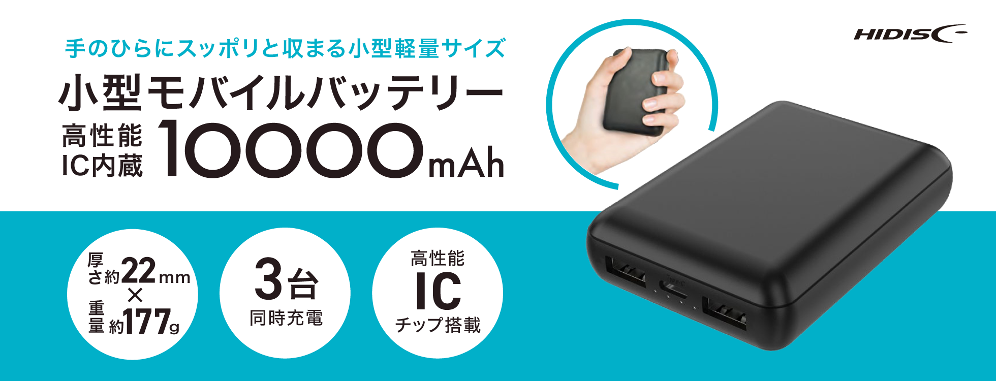 - HD4-MBTC10000BKP/高性能IC内蔵 10000mAh 薄型モバイルバッテリー ブラック OPPパッケージ