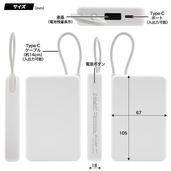 固体電池(ゲルポリマー型電解質採用半固体電池)採用で、高い安全性を実現した10000mAhモバイルバッテリーです。PSE技術基準に適合しており、約1000回の充放電サイクル対応のため長寿命設計&経済的。充電用ケーブル要らずのケーブル一体型で、持ち運びや携帯に便利です。
