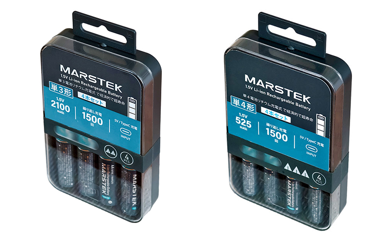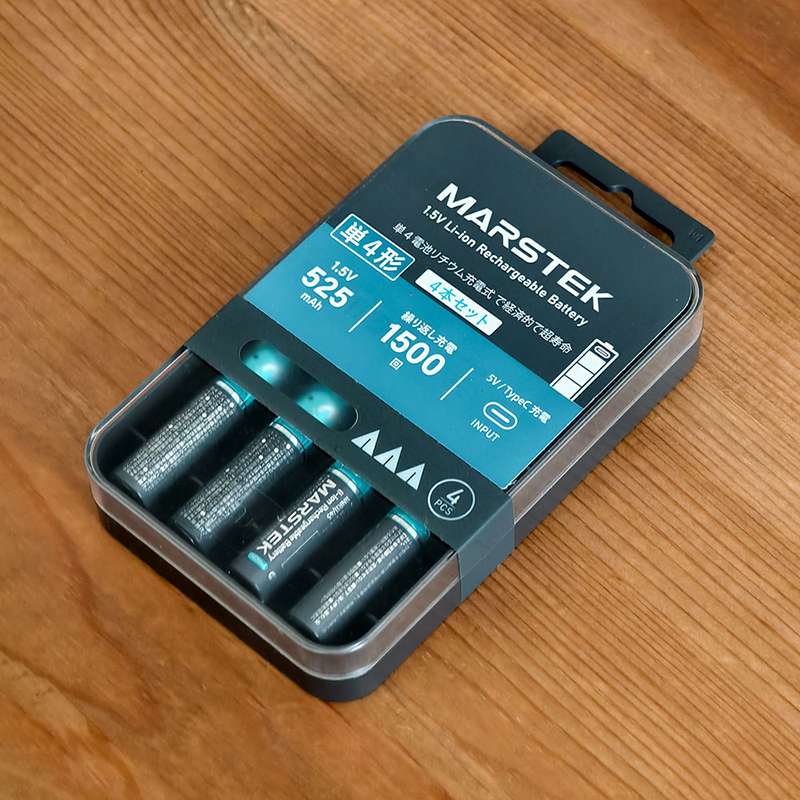 メーカー MARSTEK MARSTEK モデル 5070C(4P) 7018C(4P) 種類 単3形リチウムイオン充電池 単4形リチウムイオン充電池 バッテリー容量 3.7V/1,000mAh 3.7V/250mAh 出力 1.5V/2,100mAh 1.5V/525mAh 入力 Type-C 5V/320mAh Type-C 5V/180mAh 充電表示 緑LED 緑LED 動作温度 0~35℃ 0~35℃ 動作湿度 20~75% 20~75% 保管温度 -10~60℃ -10~60℃ サイズ 約50×14.2mm 約44×10.2mm 重量 15.2g 7.6g 同梱物 単3電池形充電池×4本